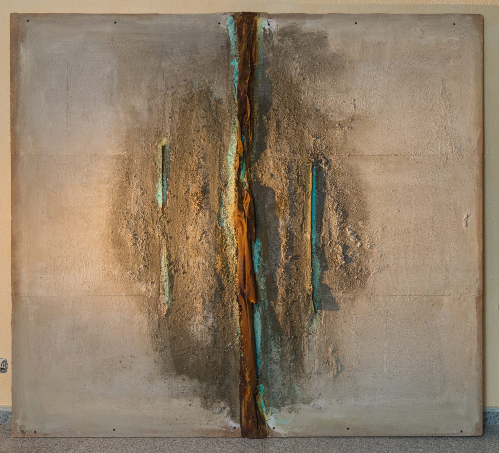 Zum Raum gehört die Farbe, das weiß die Designerin nur zu gut. Nach vielen Experimenten sind ihre Objekte inzwischen von einer materialgerechten Farbigkeit geprägt, sei es bei den Metallskulpturen und –designs oder in der Malerei, wo helle und dunkle Erdtöne dominieren und auf die Grundlagen der Gestaltung verweisen: auf das rituelle Anmischen von Erde zum Auftragen auf Gegenstände und damit zu deren kultureller Überhöhung. Also dominieren insgesamt auch die gedeckten, erdigen Farben über das Anorganische, Chemische – ein dunkles Ochsenblutrot, ein mattes Indigo-Blau, das sind die Farben der Hölzer, die dann selbst wieder Hasendraht oder andere, formlose Gebilde tragen, die sich als Reliefs von der Wand aus oder als Skulpturen von ihrem Sockel aus wild in den Raum hinein bewegen und dort mit dem Licht spielen. Ein Spiel ist auch die Begegnung mit diesen Reliefs – mehr als mit den Skulpturen gleicher Art –, weil das Vor und Zurück der Betrachtung mit jener Entgrenzung des Bildraums umgeht, die die Malerei seit dem Zweiten Weltkrieg umtreibt. Hier spielt vor allem die Definition des Grundes eine Hauptrolle, denn dieser kalibriert den Blick auf das Verhältnis von Kunstwerk und Wand. 3 Und diese Kategorie ist eine der wenigen, die aus dem Design in die bildende Kunst hinüber führt.